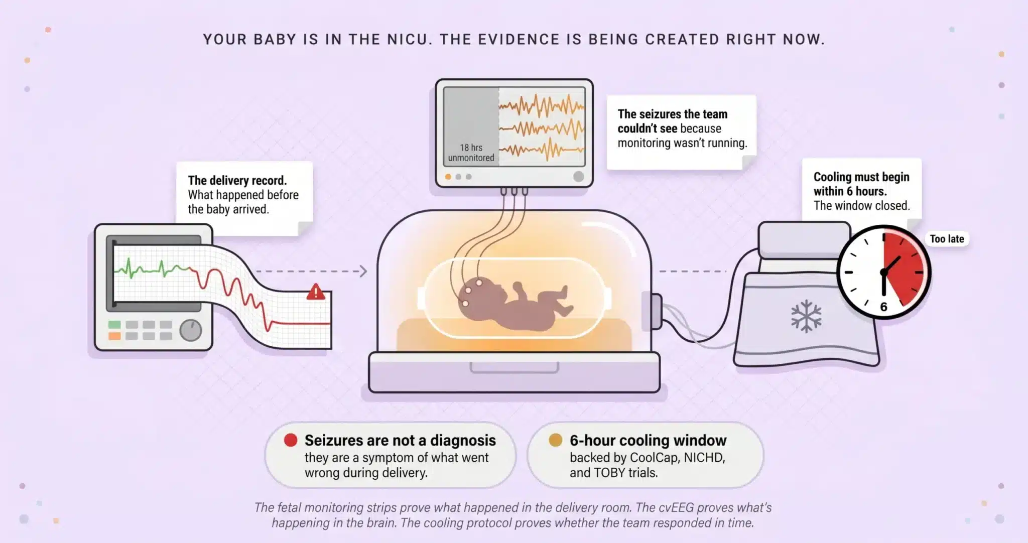 Now consider what happens when the standard is not met. The baby is admitted. The NICU team orders routine monitoring but does not initiate cvEEG for 18 hours. During those 18 hours, the baby is experiencing electrographic seizures that nobody sees because there is no EEG running. Cooling, which has a strict six hour initiation window supported by the landmark CoolCap, NICHD, and TOBY trials, is not started because the clinical team did not classify the injury as moderate to severe HIE in time. When our pediatric neurology experts review the case, they reconstruct what the EEG would have shown during those missing 18 hours based on the clinical trajectory and the subsequent EEG findings. The seizure burden that accumulated during the gap is brain damage that did not have to happen.